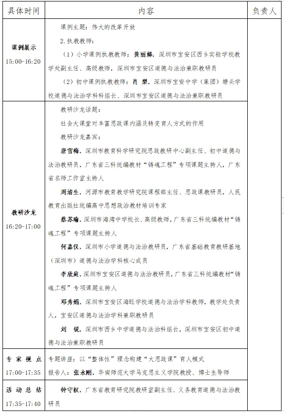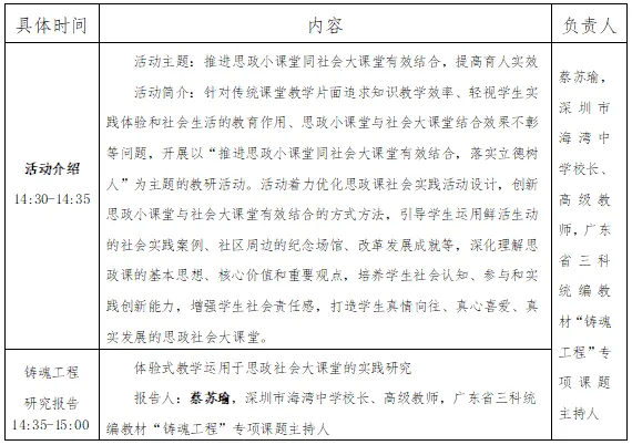 活动由成果交流、教学展示、教研沙龙和专家视点等具体环节组成。成果交流围绕广东省三科统编教材“铸魂工程”专项课题,介绍思政社会大课堂的实践和研究成果;教学展示以社会大课堂的方式,展示小学、初中两节思政课例;教研沙龙围绕“社会大课堂对丰富思政课内涵及转变育人方式的作用”话题展开讨论,深度探讨社会大课堂的内涵、价值及实施策略;专家视点围绕“大思政课”意义的社会大课堂的理论思考与实践方法展开,深度解析社会大课堂对构建、丰富、发展“大思政课”的意义。